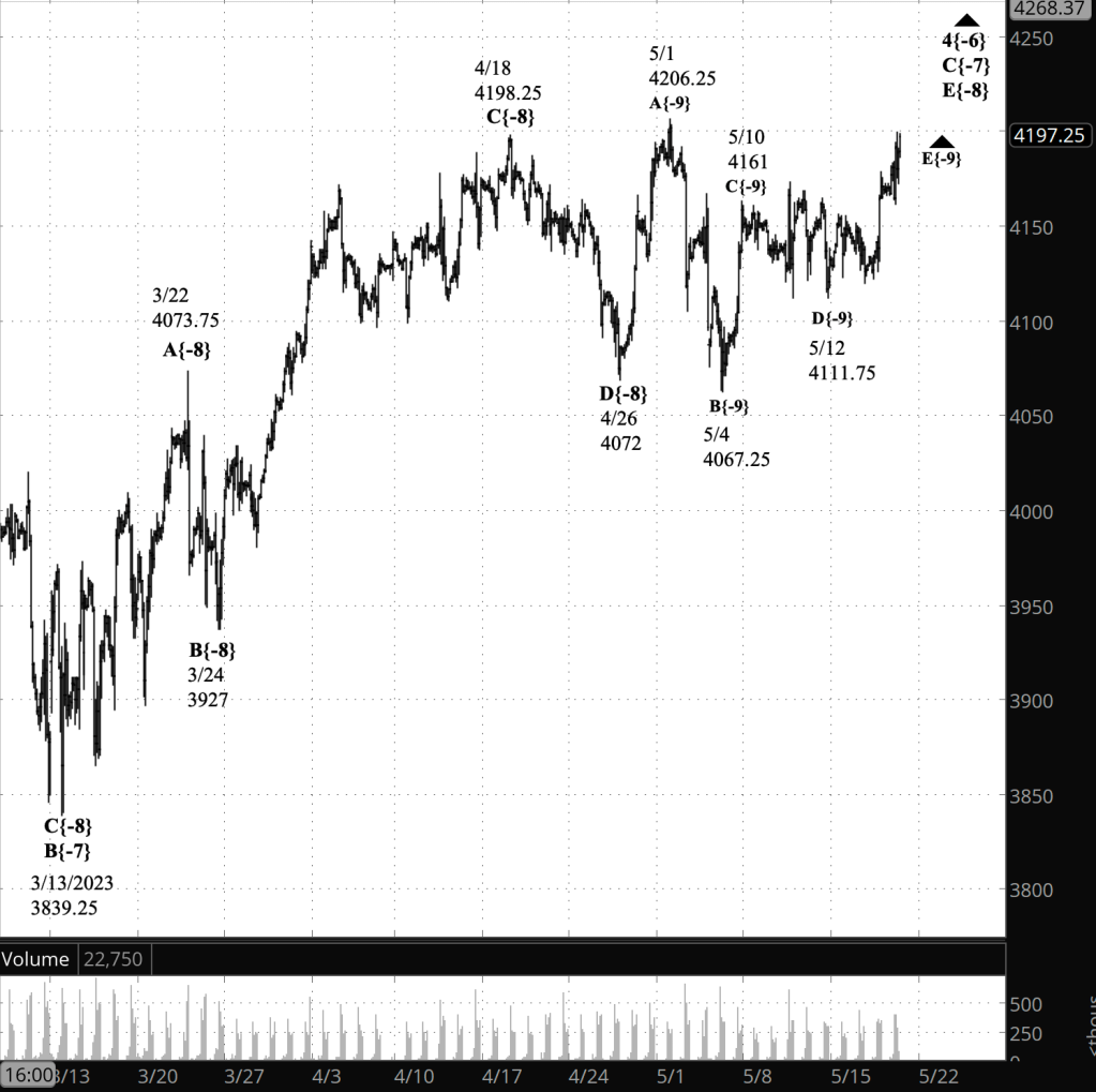 Half an hour before the closing bell. The S&P 500 futures rose further, to 4199.25. No change from this morning’s analysis. Rising wave E{-9}, a small subwave within the upward correction, wave 4{-6}, continues. I’ve updated the chart.