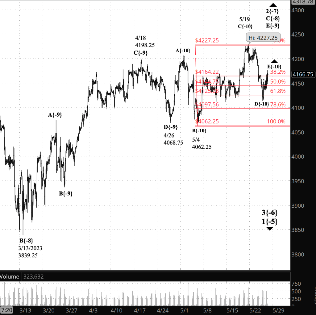 Half an hour before the closing bell. The S&P 500 futures rose during the session to 4175.50, remaining below the correction high, 4227.25, set on May 19. The movement is consistent with this morning’s principal analysis but not inconsistent with the alternatives. I’ve updated the chart.