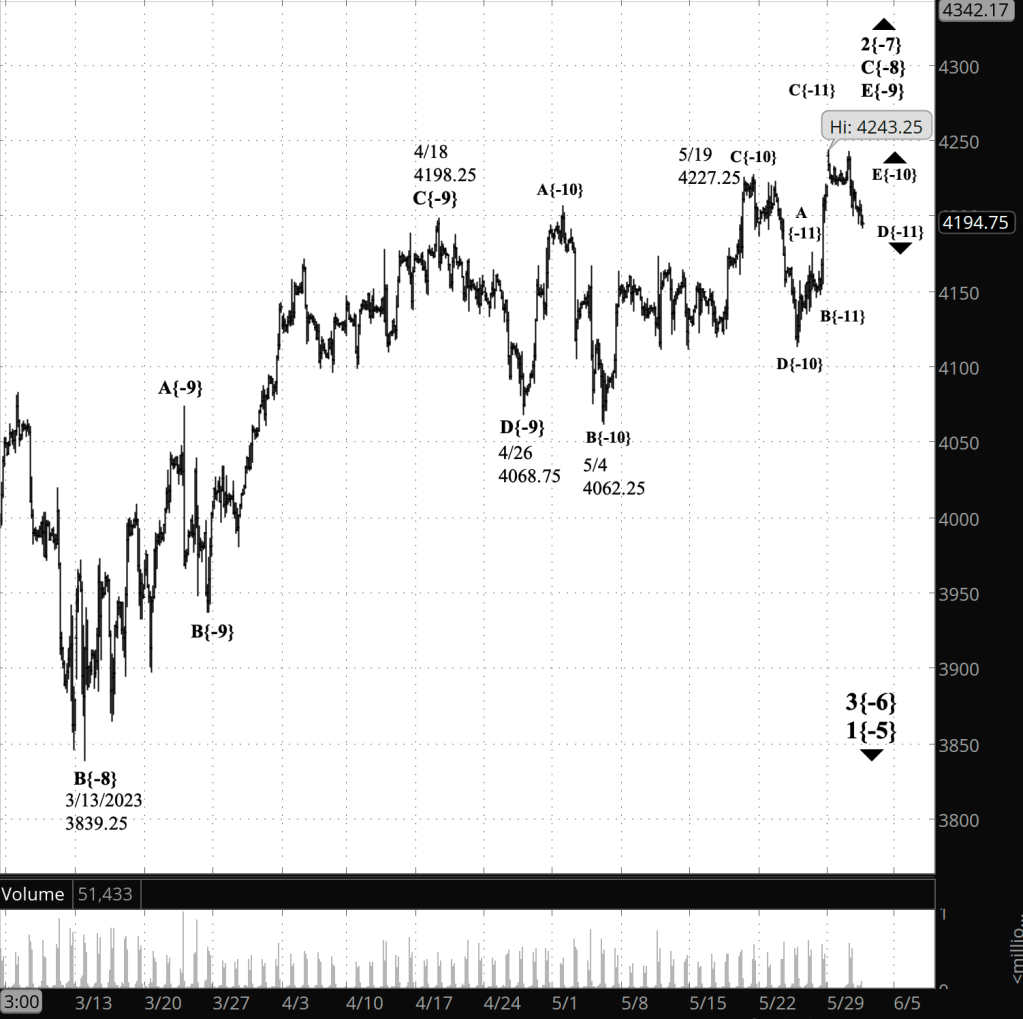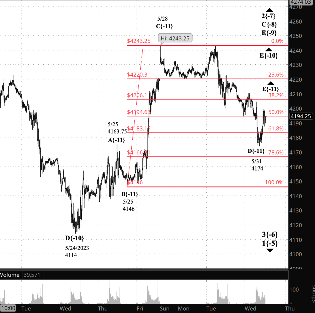 Rather than updating this morning’s chart, I’ve added a close-up to give a better view of the smallest waves that I’m tracking. On it, I’ve marked a possible analysis, although it is one that I’m uncertain about. In it, declining wave D{-11} as ended at today’s low, 4174, and rising wave E{-11} has begun. When wave E{-11} is complete, it will be the end of the correction. If the decline reverses and falls below 4174, then wave D{-11} is still underway.