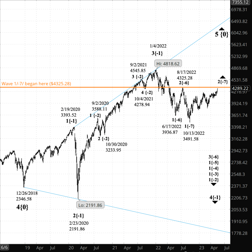 What does Elliott wave theory say? Here are the waves that underly the analyses. The We Are Here section below lists the waves encompassing the upward correction, wave 2{-7}, up to the expanding Diagonal Triangle, wave 5{0}, which began on January 4, 2022, and still larger, to uptrending wave 5{-3}, which began on July 8, 1932.