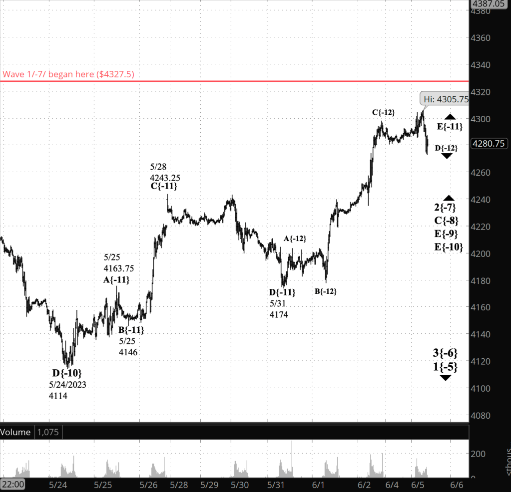 Half an hour before the closing bell. The S&P 500 futures rose during the session to 4305.75 and then declined sharply into the 4270s. The low-degree fluctuation is part of the upward correction that began on October 13 of last year.