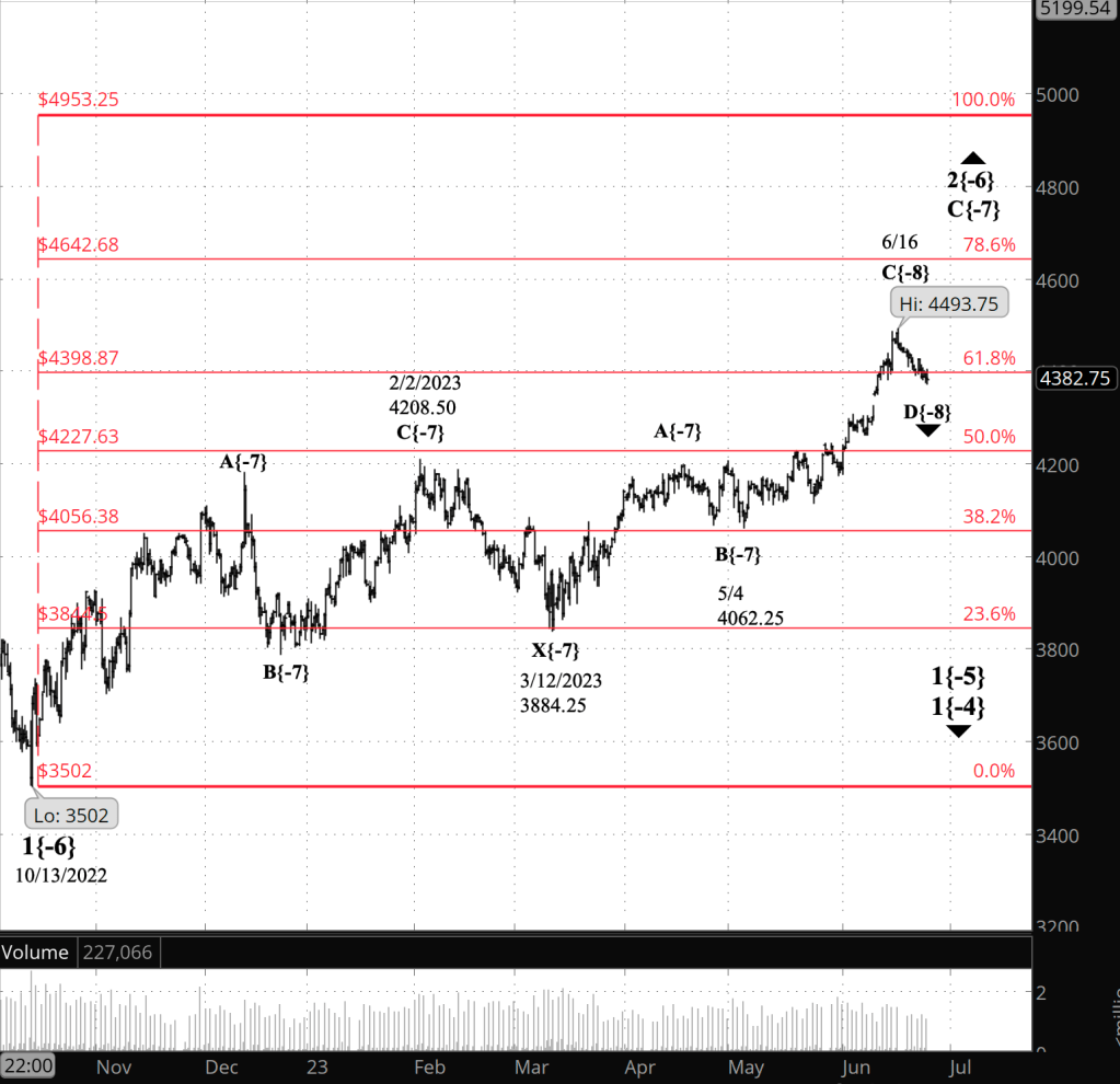 That final wave within the second pattern is in the fourth of five subwaves. When complete, that fourth subwave will be followed by a fifth and final wave that will most likely rise above the correction’s previous high, 4493.75, attained on June 16.