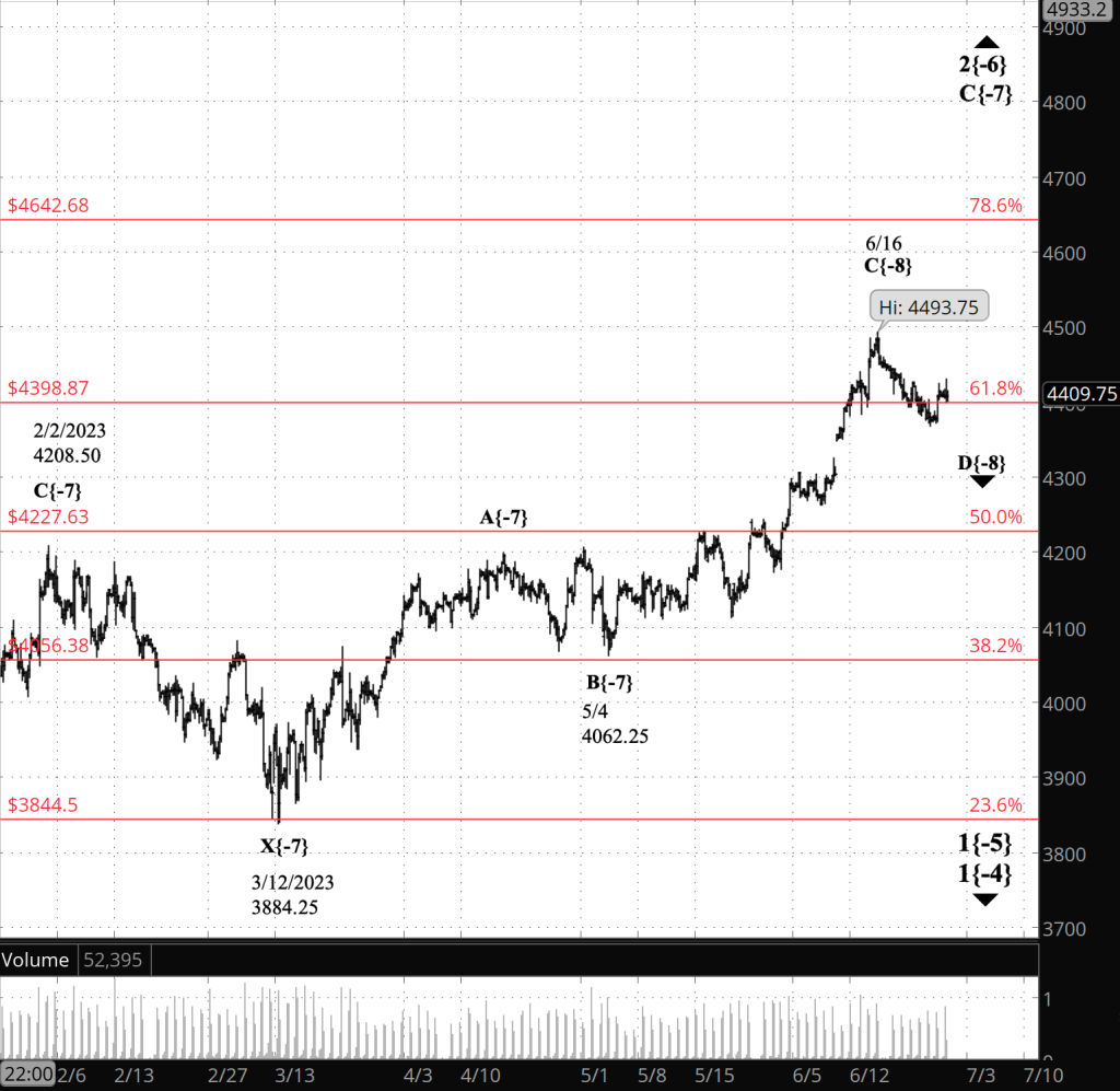 The upward compound correction, wave 2{-6} that began last October is in the final leg, wave C{-7}, of its second corrective pattern, which internally is … ambiguous. In yesterday’s analysis I described two possibilities: Either Monday’s low, 4385.75, was the end of wave D{-8}, the next-to-the-last subwave within the final leg second corrective pattern and the final wave, E{-8}, has begun. Or that low was just a small drop within wave D{-8}.