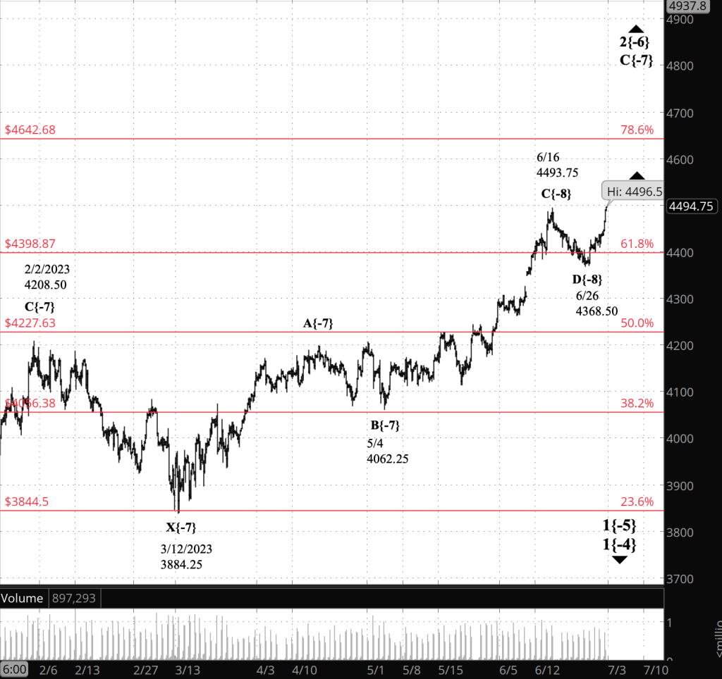 The final subwave begins. I noted this a move above the upward correction’s prior peak, 44903.75, would mean that the final subwave within the last leg of the compound correction’s second corrective pattern has begun. The price this afternoon has moved to 4494.25 (so far), meaning that the final subwave is underway. In Elliott wave terminology, wave E{-8} within wave C{-7} within the correction, wave 2{-6}, has begun.