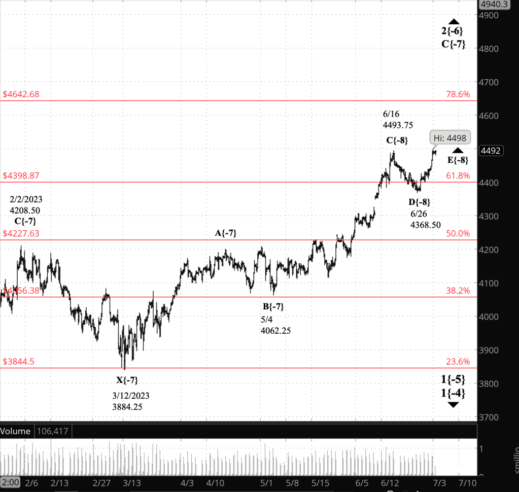 - Under the rules of Elliott wave analysis, wave 2{-6} cannot move beyond the beginning of wave 1{-6}, which was the January 4, 2022 peak at 4953.25. (I’ve adjusted the January 4 peak.)