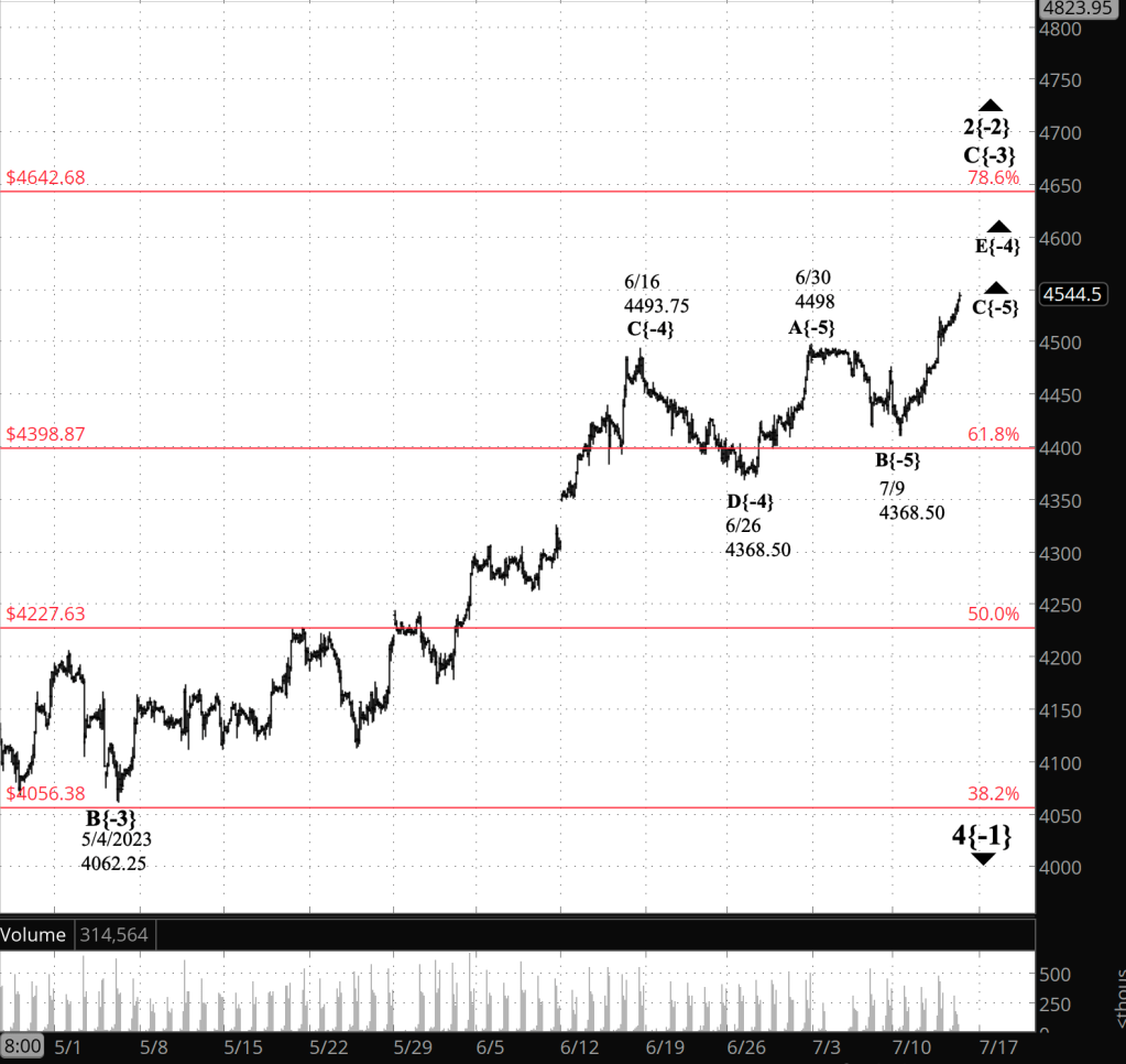 There is an upper limit on how high the upward correction can rise. It is the starting point of the preceding first wave, 1{-2}, which began on January 4, 2022 from 4953.25. A move above that level would invalidate the present analysis and require a re-analysis.