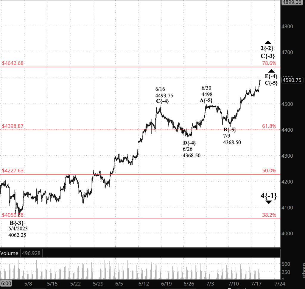 Half an hour before the closing bell. The S&P 500 futures rose during the session, reaching into the 4590s. No change from this morning’s analysis. The second corrective pattern within a rising upward correction that began last October continues. I’ve updated the chart.