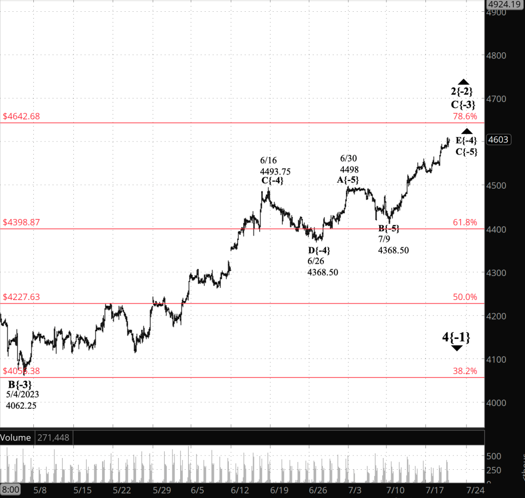 As the opening bell approached, the price broke past yesterday’s peak, 4594.50 and in the first few minutes of the session reached higher, to 4603. Any higher high continues the last leg of the corrective pattern. Alternatively, any high is potentially the end of the corrective pattern.