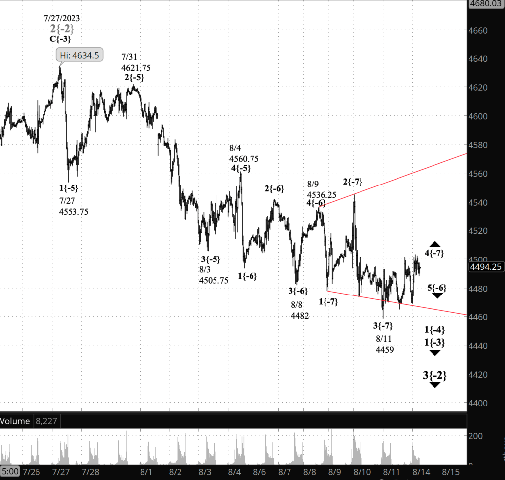 To accomodate the sideways pattern, I’ve moved the endpoint of wave 3{-7} to Friday’s low, 4459.