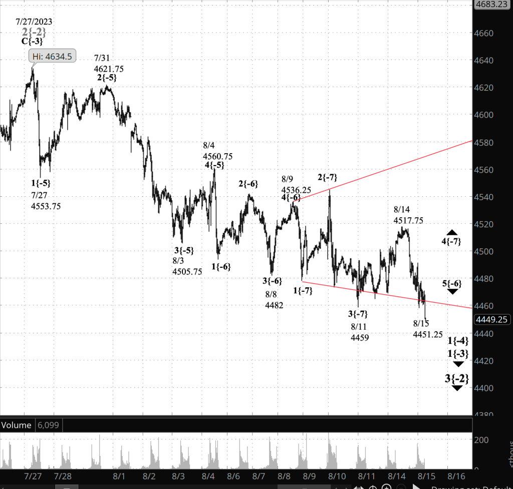 - Rising wave 4{-7}, a subwave of wave 5{-6}, an expanding Diagonal Triangle, ended today, August 16, at 4517.75. Declining wave 5{-7}, the final subwave of the triangle, began from that point.