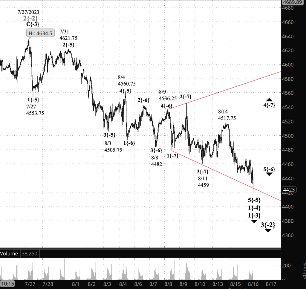Sometimes waves are truncated — they fall short of the boundary by a considerable amount. If that’s the case here, then the rising 4th wave ended at the August 14 high, 4517.25, and the declining 5th wave began.