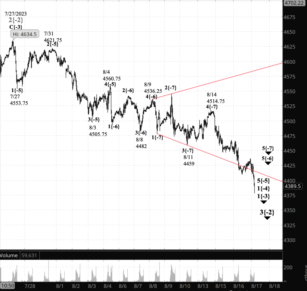 Half an hour before the closing bell. The S&P 500 futures fell further during the session, reaching into the 4370s. The decline lends credence to this morning’s second analysis, which sees the 5th and final subwave within the expanding Diagonal Triangle as being underway.