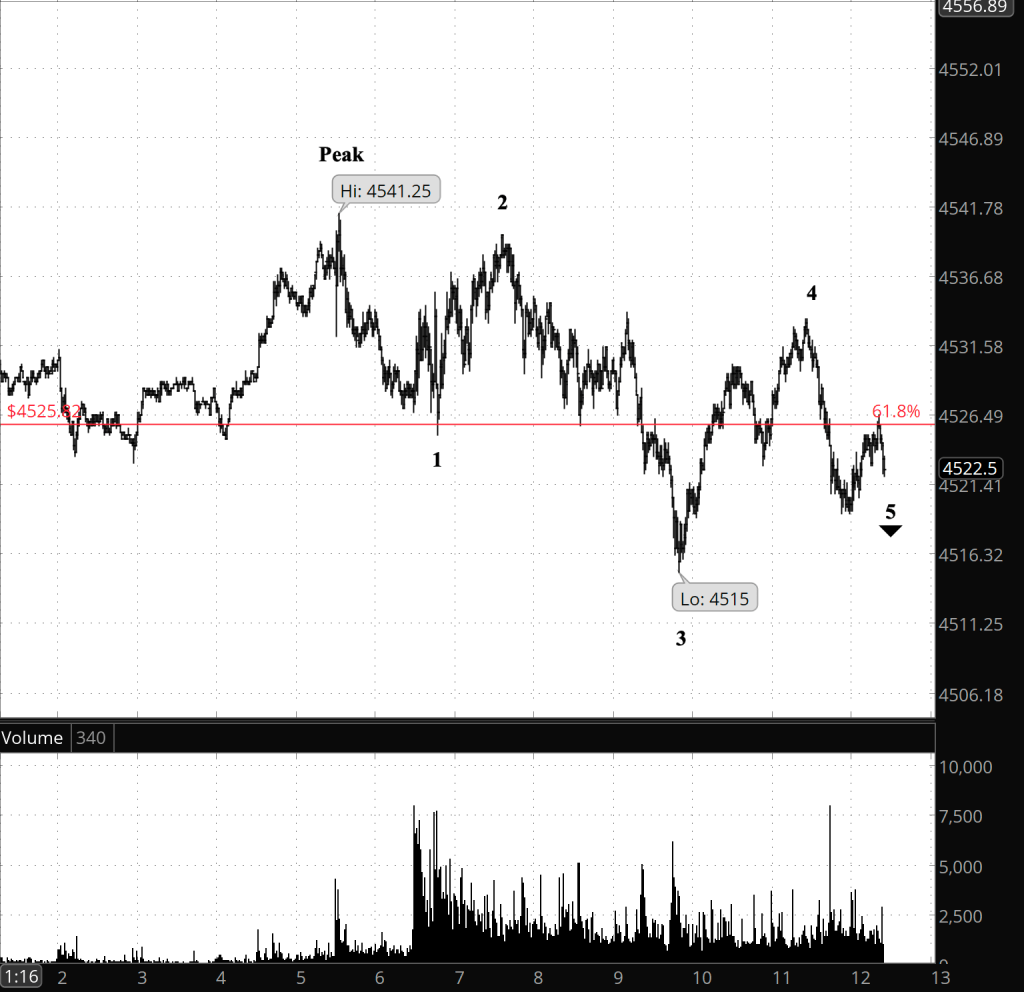 What it means is still up in the air. The trend is of a small degree, taking only a few hours to reach completion. It could be a subwave within the final wave of the upward correction, it could be the start of a connecting wave that will lead to a second corrective pattern within the correction, or the correction may have ended at the peak, 4541.25, and the five waves may be the tentative first steps in what will be a powerful downtrend.