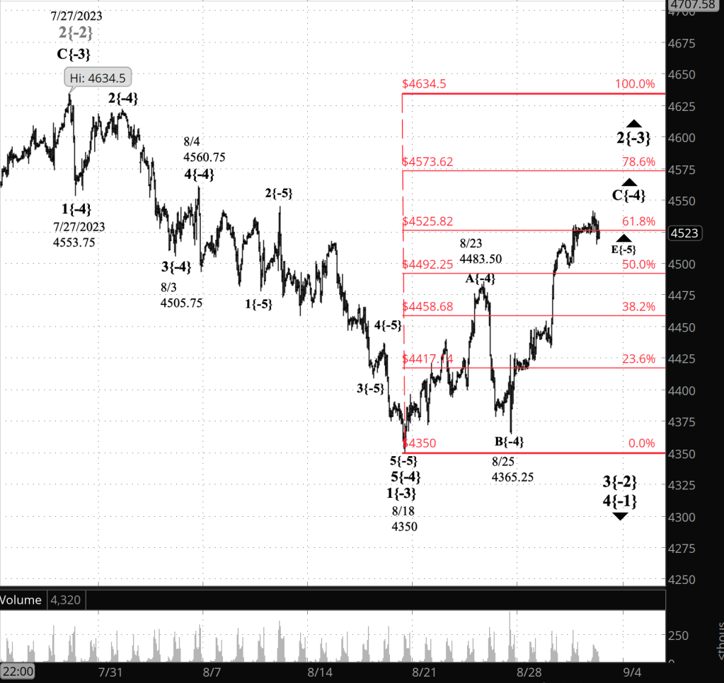What does it mean? The overnight movement left unresolved the two open questions about the chart: First, is the upward corrective pattern that began on August 18 still underway, or has it reached its end? And second, if the corrective pattern has ended, then has the overall correction, a 2nd wave, also ended, or will it be a compound correction, containing two or three corrective patterns?