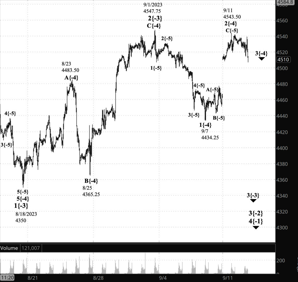 Half an hour before the closing bell. The S&P 500 futures rose to 4539 during the session and then retreated below 4510. The price remained below the high set on September 11, which I’ve labeled as the end of the upward correction that began on September 7.