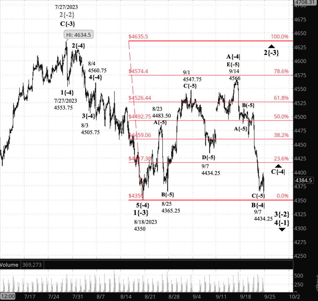 What does it mean? The decline brought the price to within $16 of starting point of the upward correction that began on August 18, from 4350. Had the price fallen below that level, it would have discredited the present Principal Analysis and replaced it with Alternative #1, a scenario that the 2nd wave upward correction ended on September 14 and a 3rd have downtrend has begun.