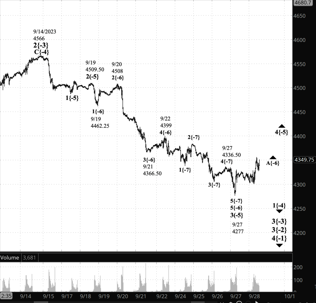 Under the rules of Elliott Wave Theory, a 4th wave cannot move beyond the end of the preceding 1st wave of the same degree. In this case, that’s wave 1{-5}, which ended on September 19 at 4462.25, and wave 4{-5} cannot move above that level.