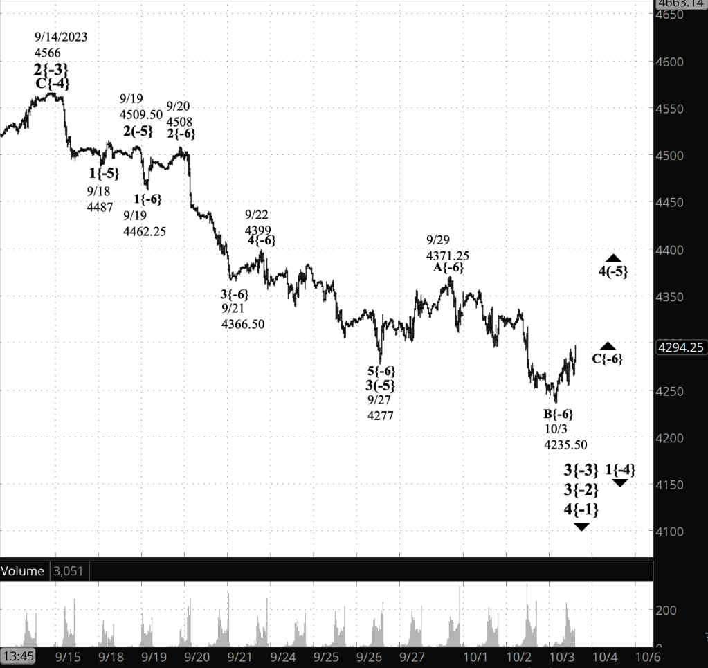 - Downtrending wave 5{-5} is underway, having begun on September 29 from 4371.25.