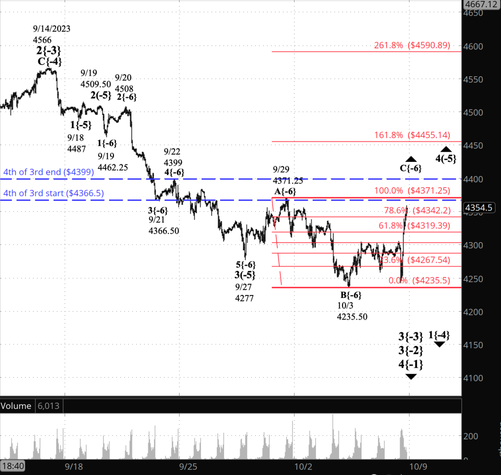 - Downtrending wave 5{-5} is underway, having begun on September 29 from 4371.25, the date the preceding wave 4{-5} ended. Internally, it is presently in an upward correction, wave 2{-6}.