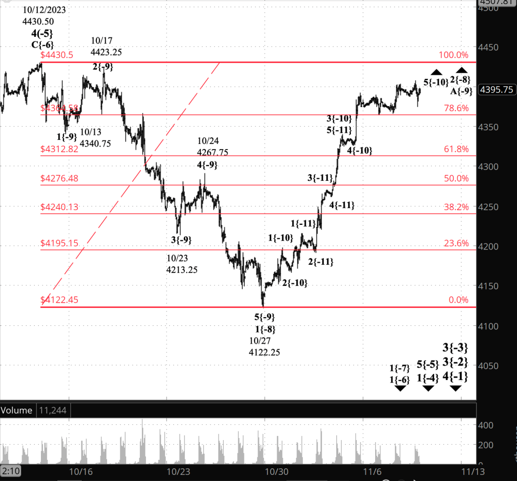 What does it mean? The first subwave, wave A, of the 2nd-wave upward correction that began on October 27 continues trying to find its endpoint. The price has moved decisively above a major Fibonacci turning point, a 78.6% retracement, and has come within 30 points of the start of the preceding 1st wave, 4430.50.