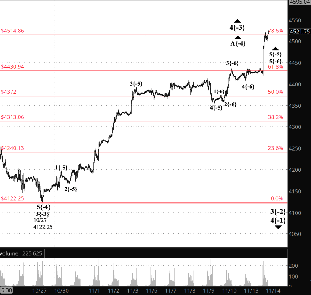 Half an hour before the closing bell. The S&P 500 futures gently rose to the 78.6% Fibonacci retracement level during the session, following a dramatic pre-opening rise coinciding withe release of inflation figures for October. The session high, and indeed the high for the entire first subwave of the wave 4 upward correction that has been with us since October 27, is in the 4520s, about 30 points away from the firm upper limit required by Elliott Wave Analysis, 4553.70.