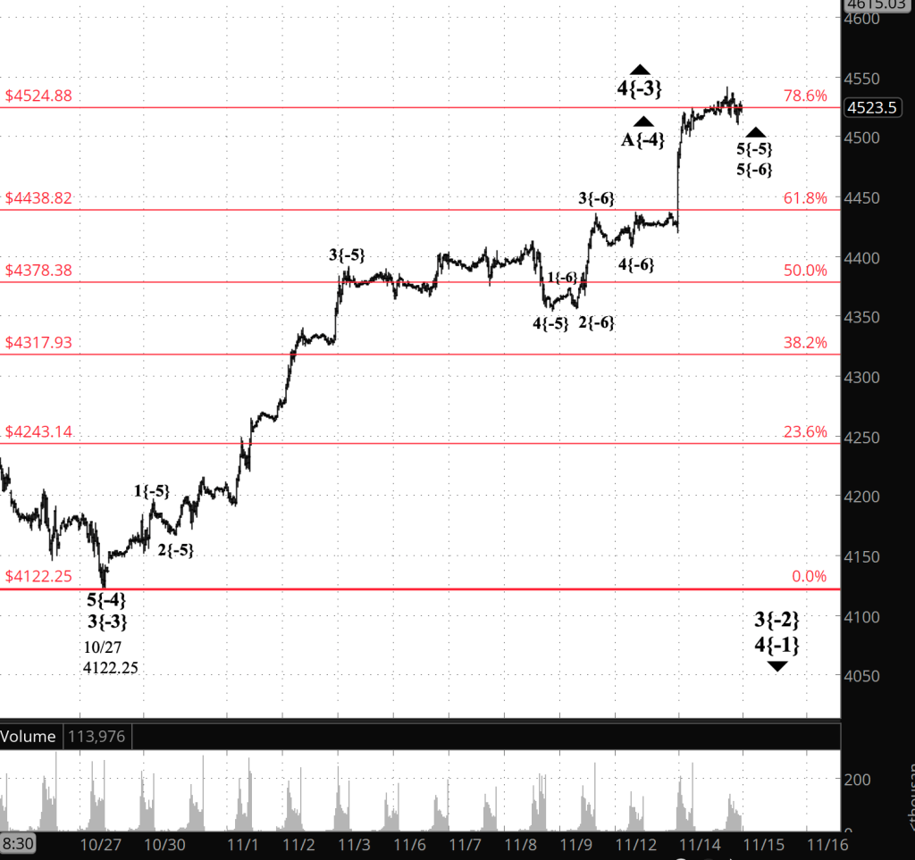 Half an hour before the closing bell. The S&P 500 futures kept to a $15-range during the session, breaking out on a few occasions and quickly returning. The overnight high, 4541.25, hasn’t been challenged as wave A continues to search for its end point, The A wave is the initial wave within the 4th-wave upward correction that began in late October.