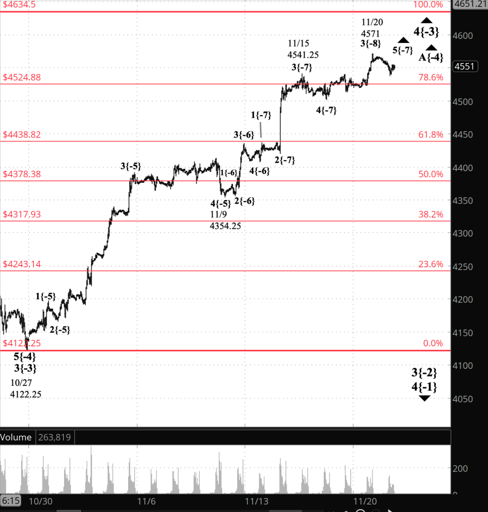 And what of yesterday’s rise? I count it as having completed it’s 3rd subwave at the November 20 peak: Wave 3{-8}. The overnight dip is wave 4{-8}, and it will be followed by rising wave 5{-8}, whose end will cascade up the fractal structure to also be the end of waves 5{-7}, 5{-6}, and A{-4}.