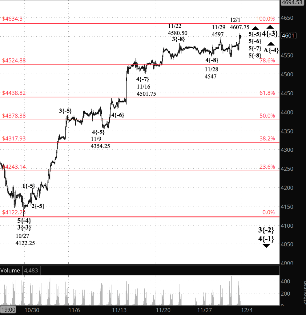 Half an hour before the closing bell. The S&P 500 futures crept to a new high during the session, lending credence to this morning’s principal analysis. Wave A within the upward 4th-wave correction that began on October 27 continues. Unless, of course, the new peak is the end of wave A and the beginning of wave B. I’ve updated the chart.
