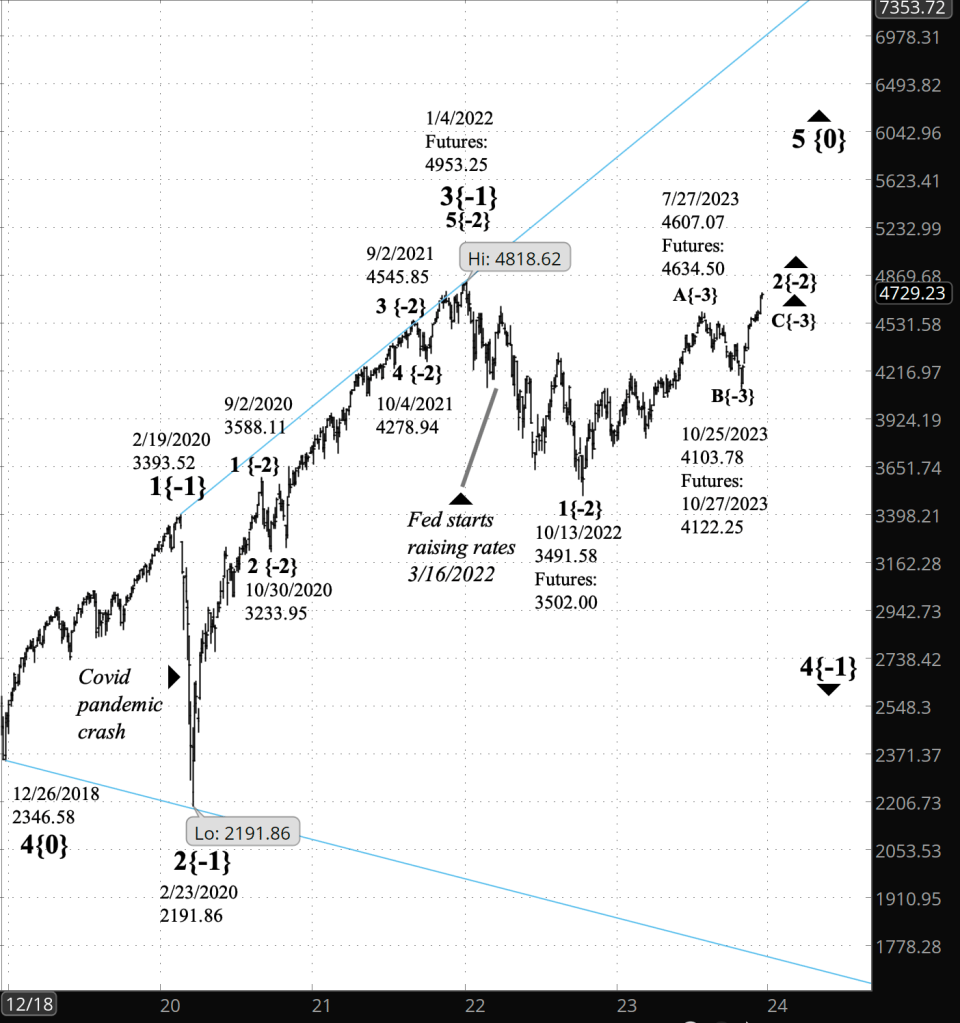 Charts. There are two. The upper chart, of the futures, focuses on wave C, which began on October 27 this year. The lower chart, of the S&P 500 index, shows the expanding Diagonal Triangle that began on December 26, 2018, of which the present 2nd-wave correction is a subwave two degrees lower.