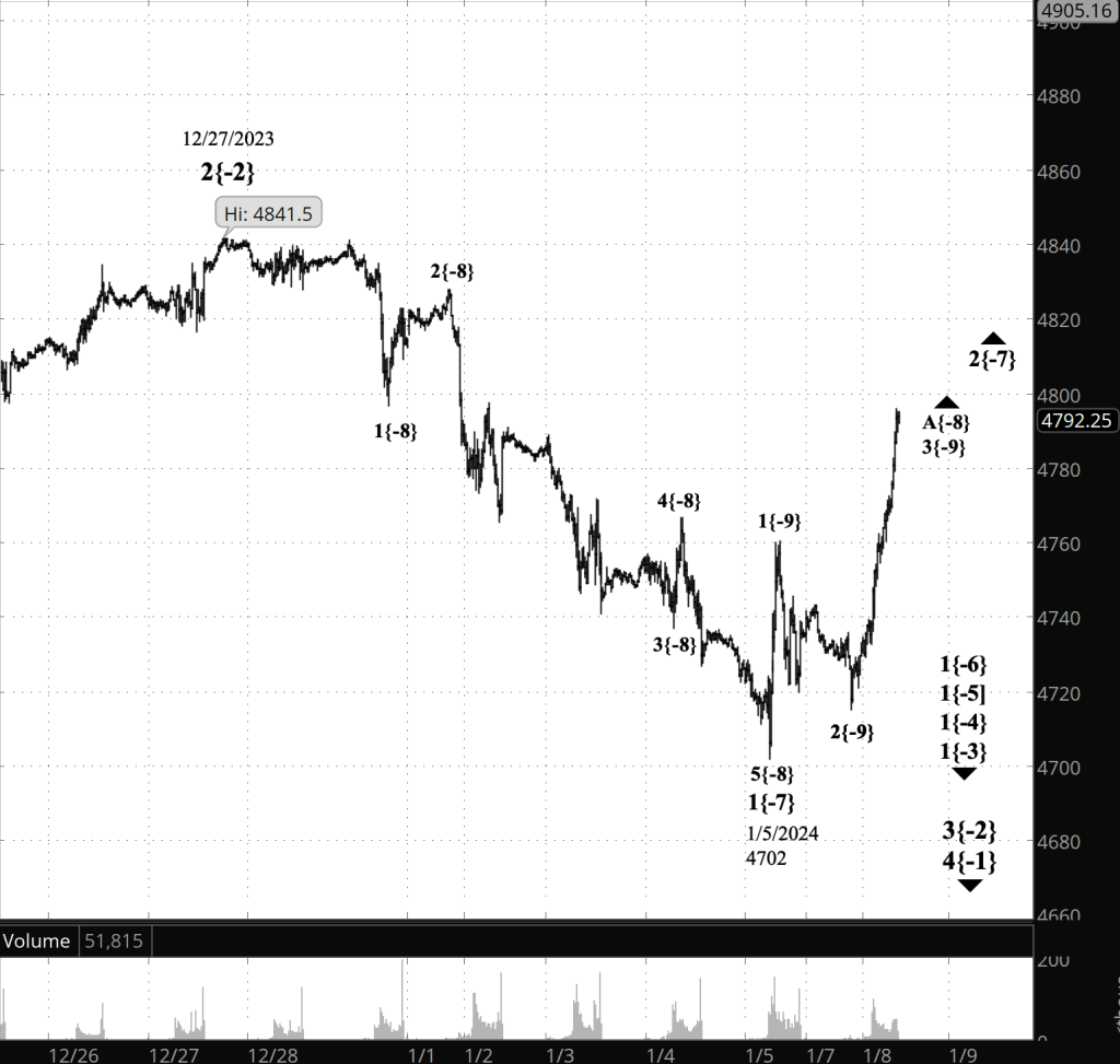 - Deep within that downtrend’s 1st wave, downtrending wave 5{-8} and its parent, wave 1{-7}, ended at the overnight low, 4702. Wave 2{-7} is now underway, an upward correction of low degree, and within it, wave A{-8} is underway.