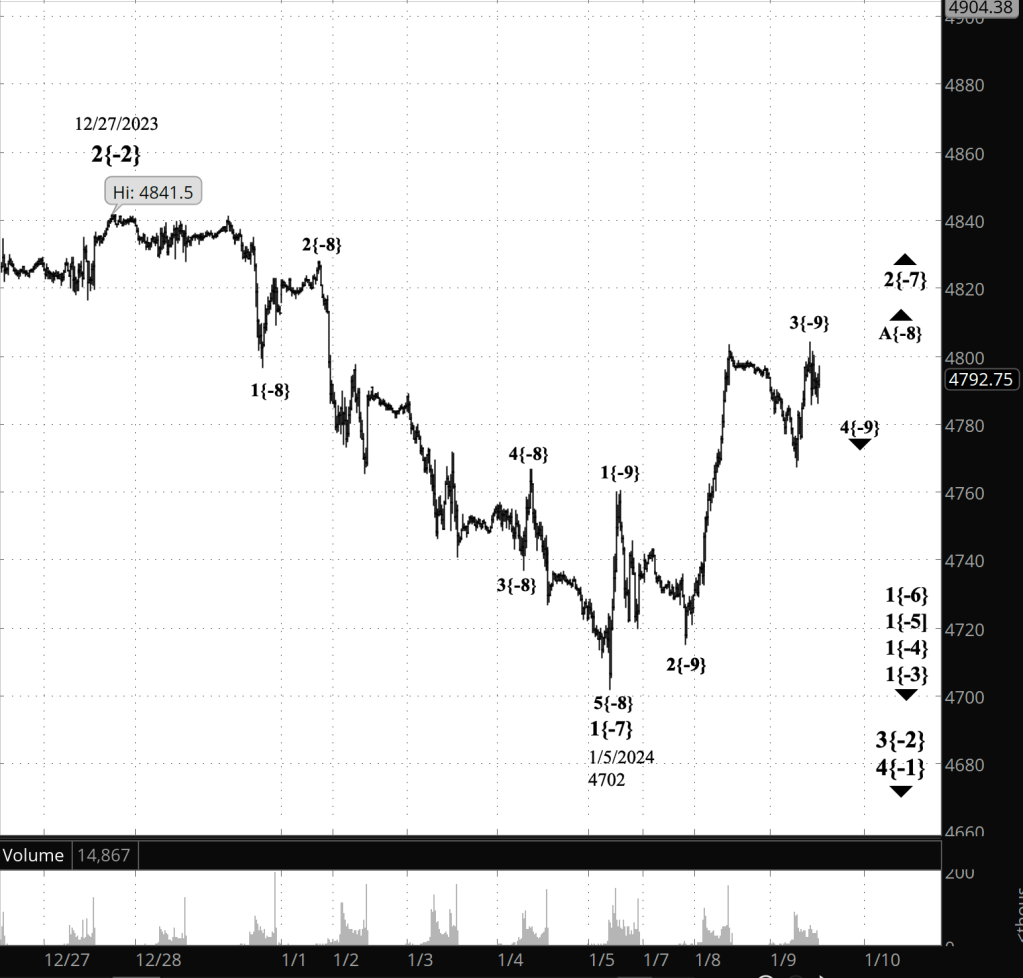 Half an hour before the closing bell. The S&P 500 futures moved above the overnight high to a higher high, 4804, and I’ve moved the label for the end of wave 3{-9} to that session high. Otherwise, no change from this morning’s analysis. The 2nd-wave upward correction that began on January 5 continues to work through its initial subwave, rising wave A{-8}.