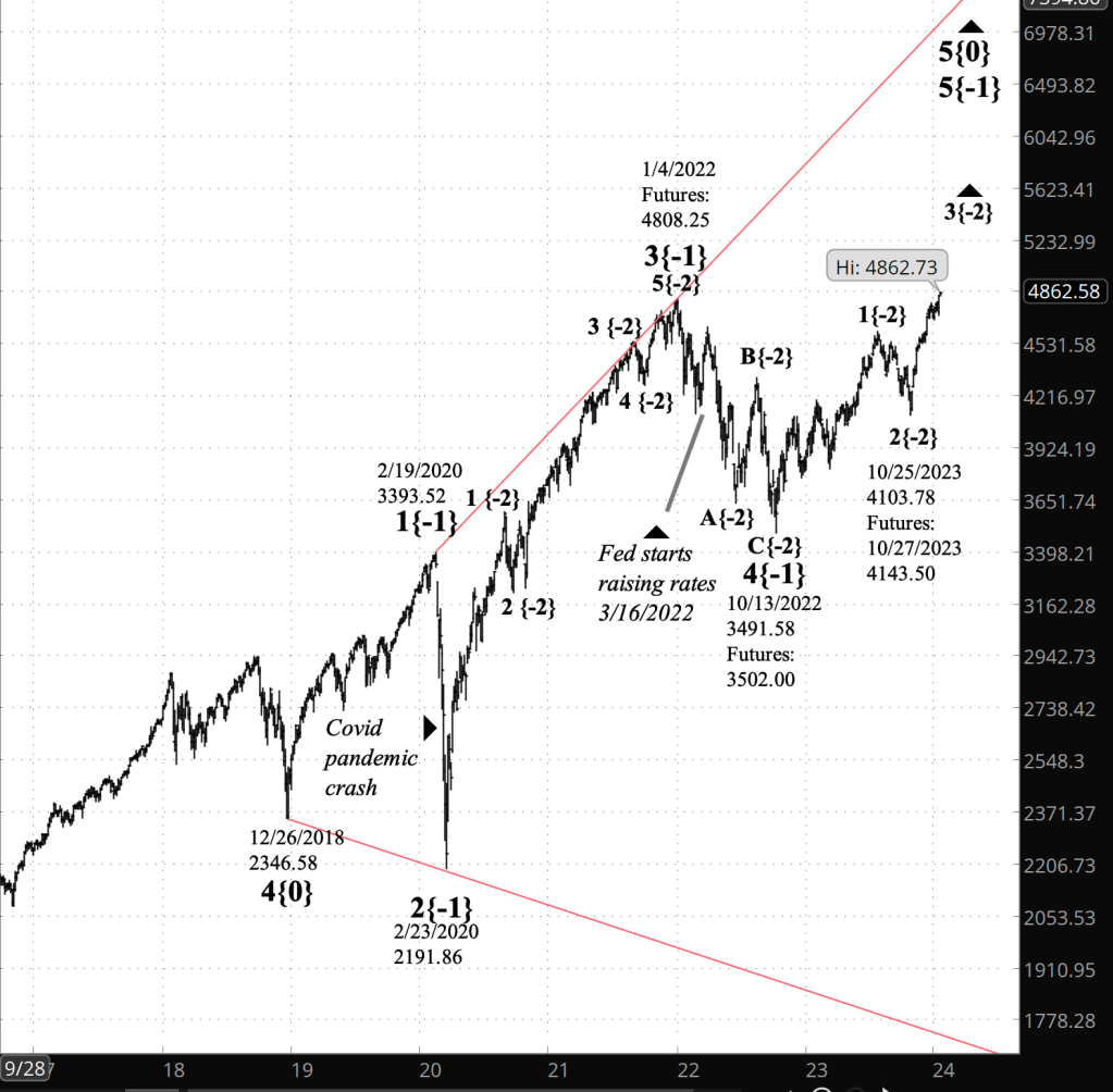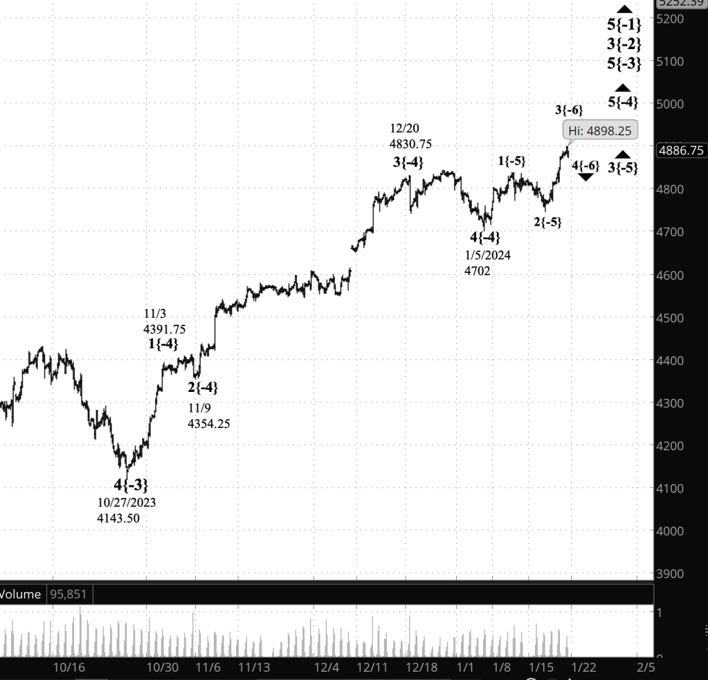Charts. The upper chart shows the S&P 500 futures, focusing on uptrending wave 5{-3} and its internal structure, all subwaves of wave 3{-2}, which appears on the lower chart.