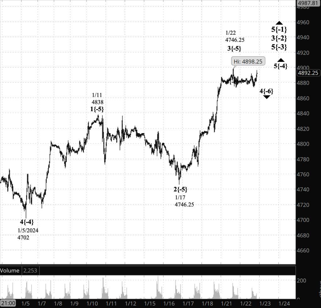 Half an hour before the closing bell. The S&P 500 futures remained between the 4870s and the 4890s during the session. The low-degree 4th-wave downward correction within a series of larger uptrends continues. I’ve updated the chart.