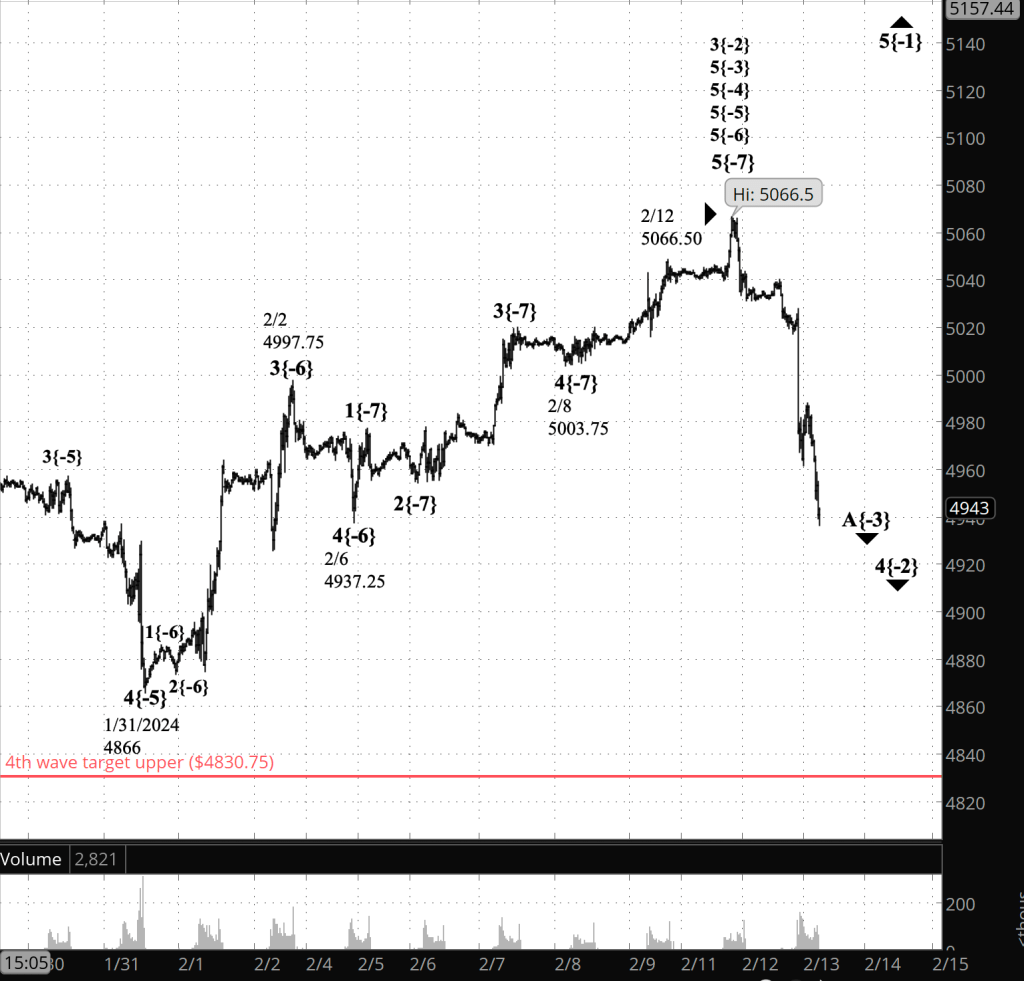 What does it mean? The decline is the first subwave, wave A, of a 4th-wave downward correction that began on February 12 from 5056.50. The overnight decline brought the price into the 4960s as the opening bell approached.