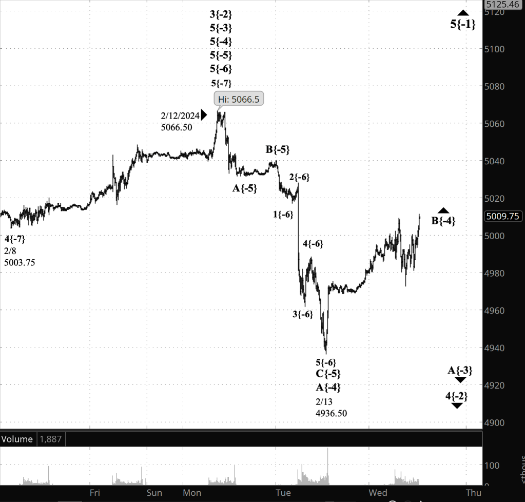 Half an hour before the closing bell. The S&P 500 futures continued to work through the downward correction that began on February 12. It is marked on the chart as wave 4{-2}, a retracement of a 3rd-wave uptrend, wave 3{-2}, that began on October 27, 2023.