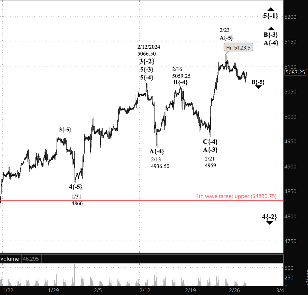 - Wave 5{-1} is the parent wave of a downward correction, wave 4{-2}, that began on February 12, 2024.