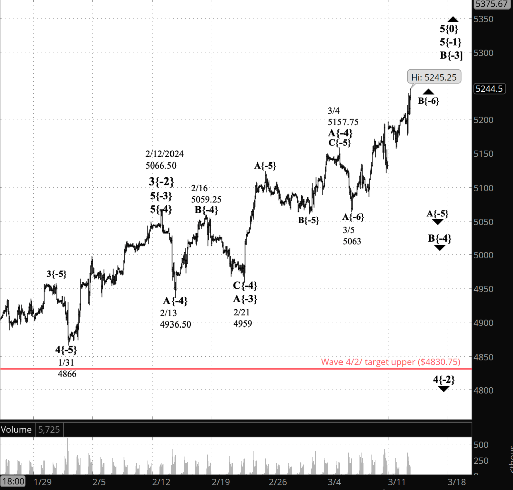 Half an hour before the closing bell. The S&P 500 futures rose slightly during the session, reaching a new high in the 5240s so far. The small rising B-wave buried deep in the ongoing 4th-wave upward correction continues. I’ve updated the chart.