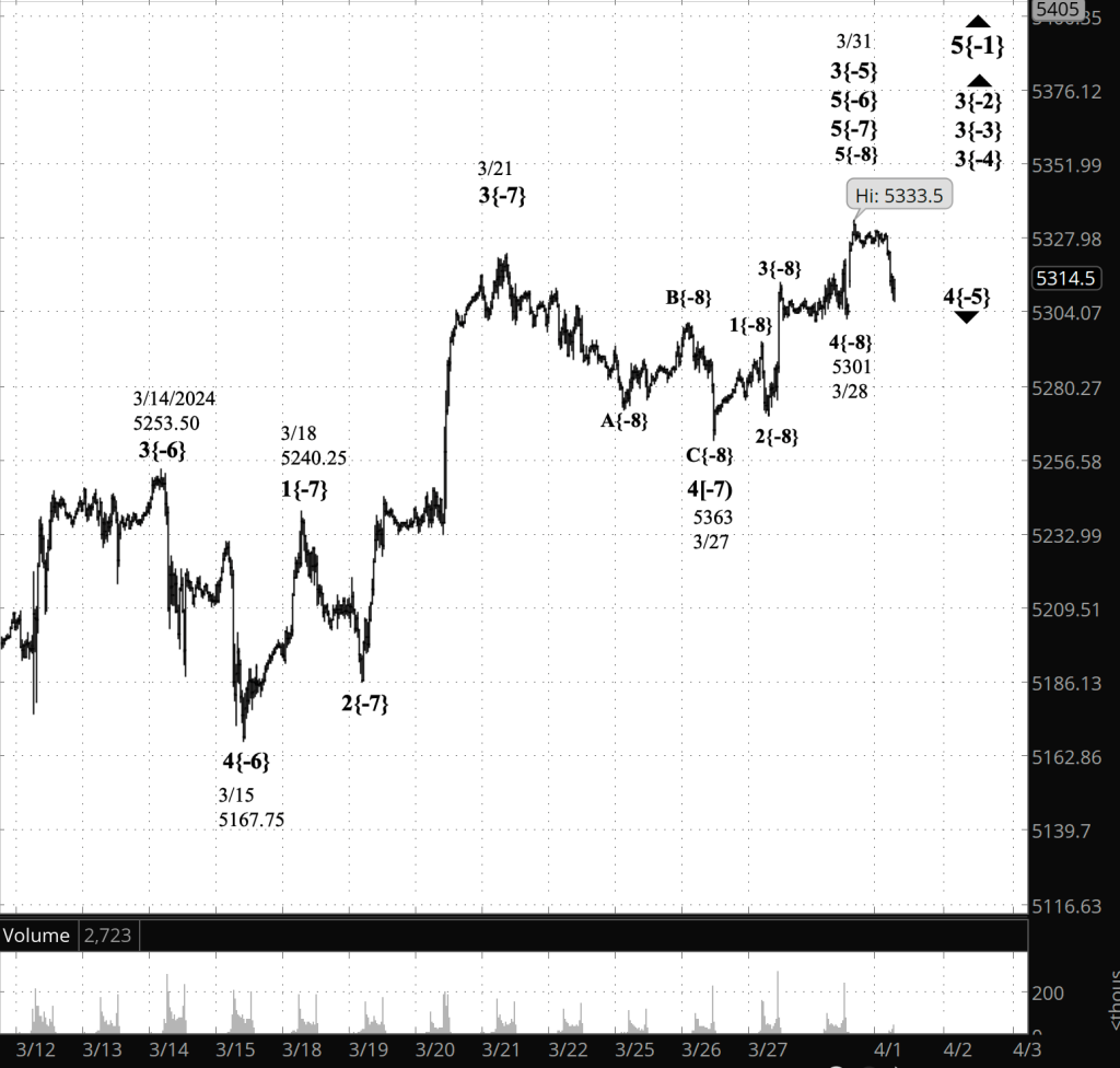What to make of all of this? The fact that the 5th wave uptrend is in its 5th subwave means that any new high could be its end. The 5th wave is itself the final subwave of a larger 5th wave uptrend that began on March 15. Up one more degree, the end of the two smaller 5th waves also means the end of a larger 5th wave, whose end is the end of a still larger 3rd wave that began on February 28 from 5088.
