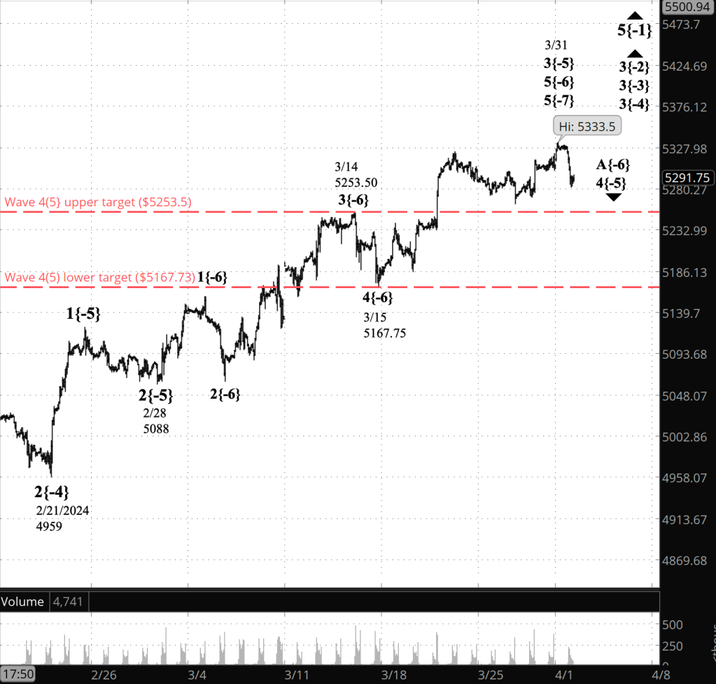 In Elliott Wave Theory, 4th waves tend to end within the 4th subwave of the preceding 3rd wave of the same degree. On the chart, that would be in the range of wave 4{-6} within wave 3{-5}, from 5253.50 down to 5167.75. I’ve marked the range boundaries with dashed red lines.