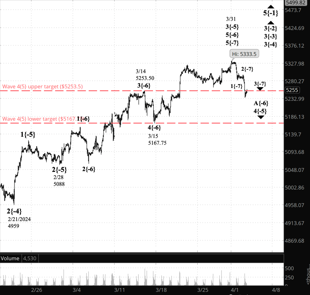 The correction is in its first subwave — wave A. The overnight decline is the 5th and final subwave of the A wave. When the A wave is complete, it will be followed by a rising wave B, which under a rule of Elliott Wave Theory never moves above the starting point of the preceding A wave. So 5333.50 is a firm cap on how far the B wave can travel. A final wave C will complete the correction. C waves almost always are longer than the preceding A wave.