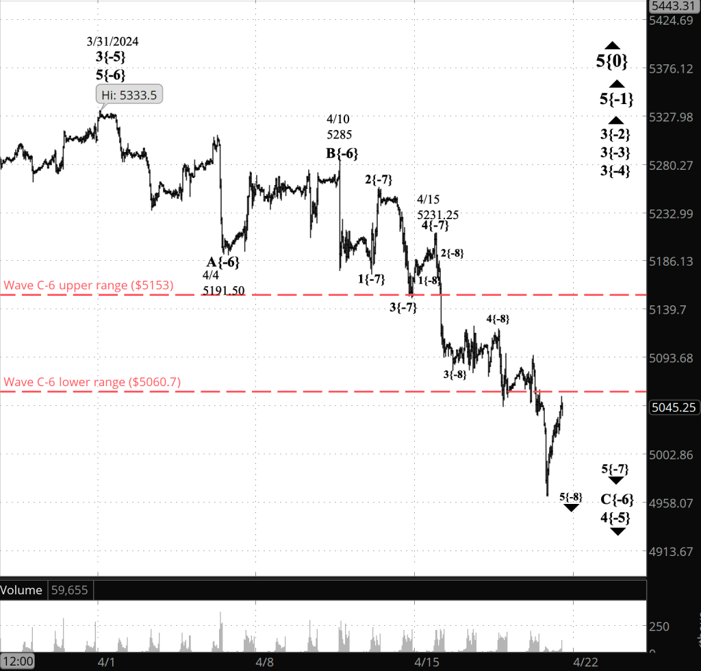 What are the alternatives? The chart can also be interpreted as the mid-April decline having reached its endpoint with the overnight low, 4963.50, and the rise that followed is the beginning of an uptrend. The principal analysis — correction within a downtrend — matches the chart better, in my opinion. Nonetheless, the alternative is a viable possibility.