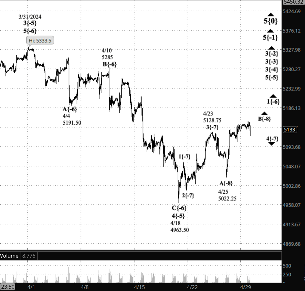 Half an hour before the closing bell. The S&P 500 futures migrated between the 5140s and 5150s during the session, dropping below 5120 as the closing bell approached. The rising B wave — the middle subwave of the 4th-wave downward correction that began on April 23, continues.