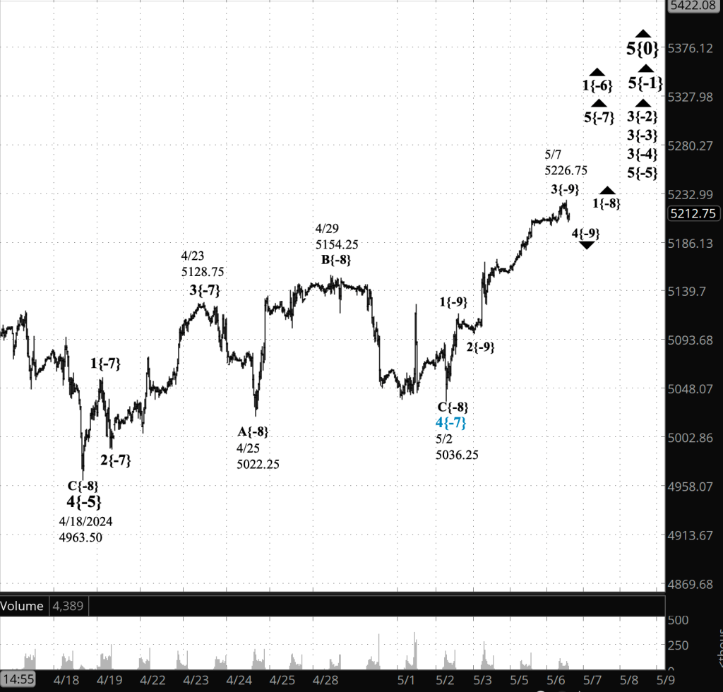 Half an hour before the closing bell. The S&P 500 futures peaked at 5226.75 during the session and then fell swiftly back into the 5210s. Applying Elliott Wave Theory, the decline is the beginning of a 4th-wave downward correction within the 5th-wave uptrend that began on May 2.