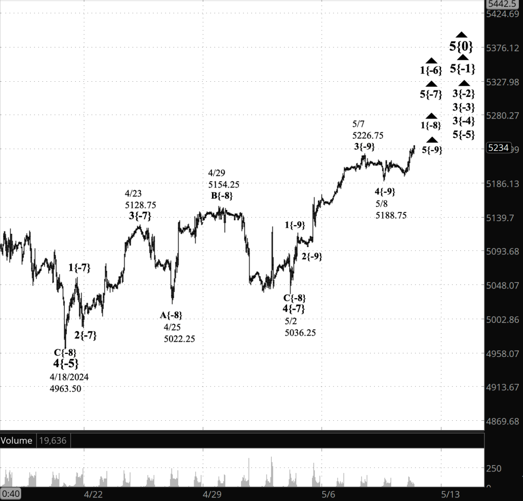 - The 4th wave ended at the May 8 low, 5188.75, and the ensuing 5th wave began from that point