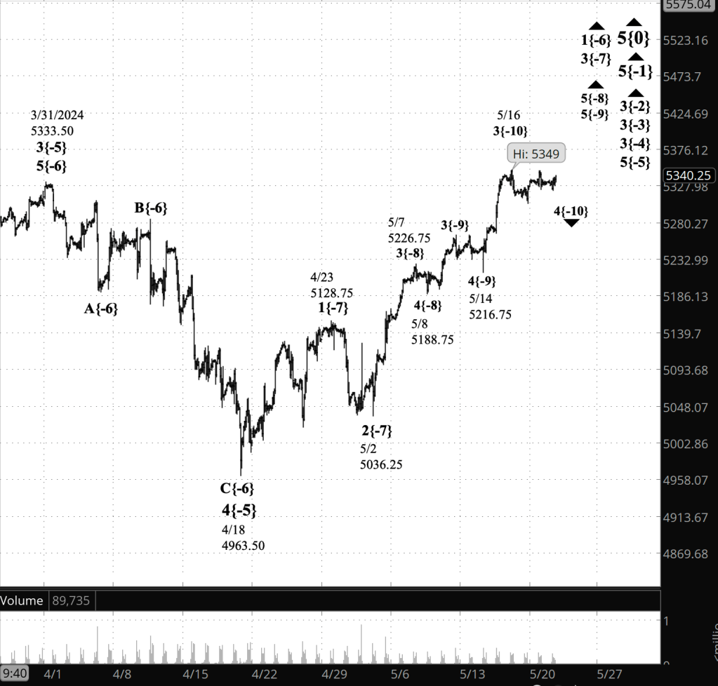 - Within wave 5{-1}, rising waves 3{-2}, 3{-3} and 3{-4} are underway, as is wave 5{-5}.