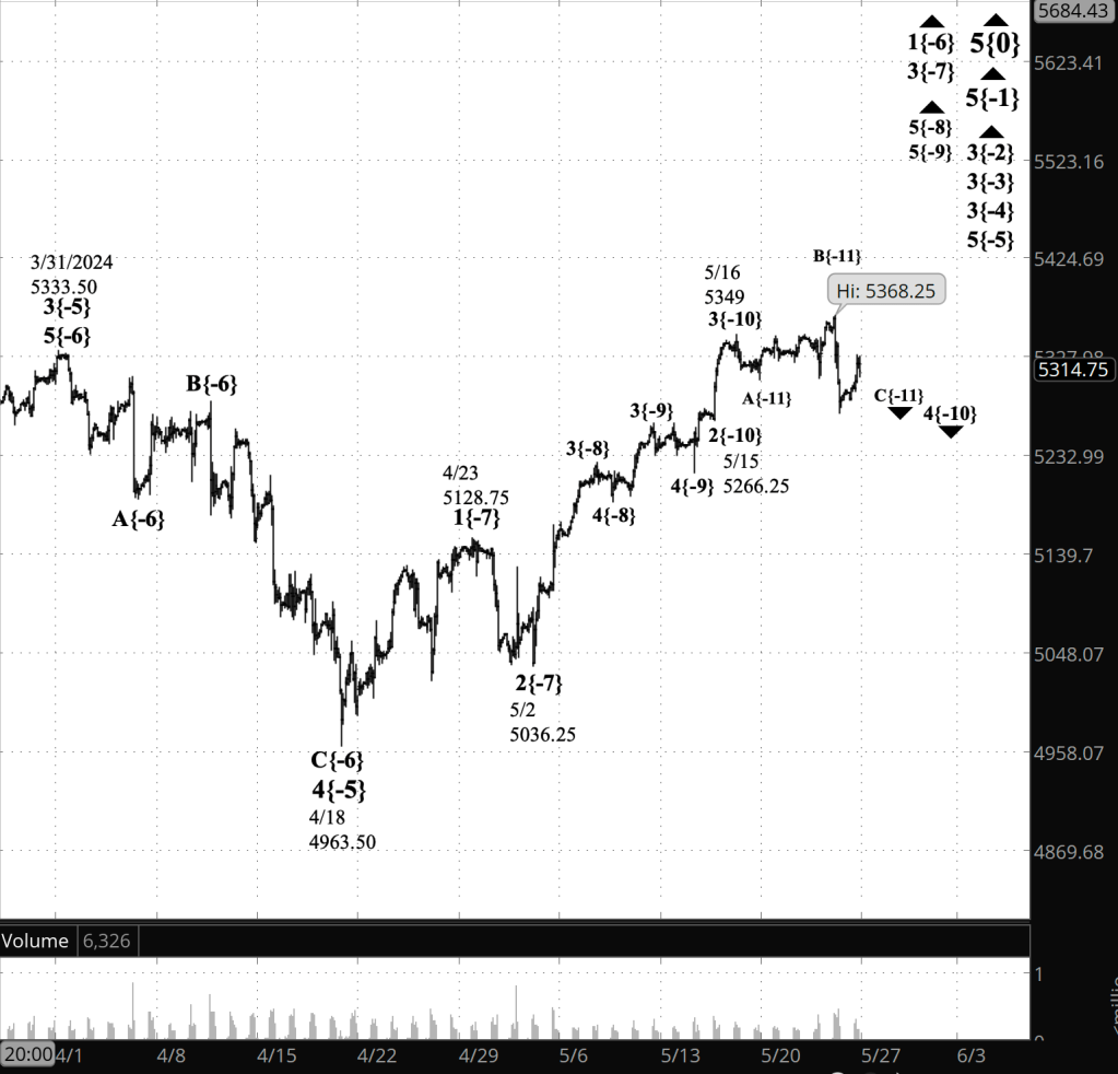 Half an hour before the closing bell. The S&P 500 futures climbed further, into the 5320s, and then dropped back slightly into the 5310s so far. Elliott Wave Theory: The session rise was the 4th subwave with wave C, the final subwave of the 4th-wave downward correction that began on May 16. The decline that followed is most likely the beginning of the 5th and final subwave within wave C. The 4th subwave of C is expected to have three subwaves, and that’s what shows on the chart. However, I’d like to see further decline to verify that wave C’s 5th subwave is underway.