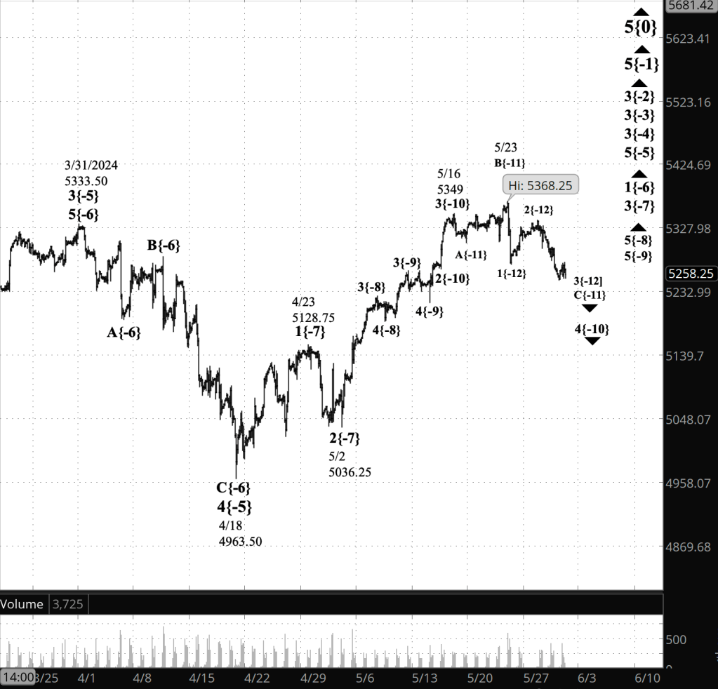 Half an hour before the closing bell. The S&P 500 futures has fluctuated between the 5250s and the 5270s during the session so far. Elliott Wave Theory: The C wave within the 4th-wave downward correction continues, with the analysis unchanged from this morning.
