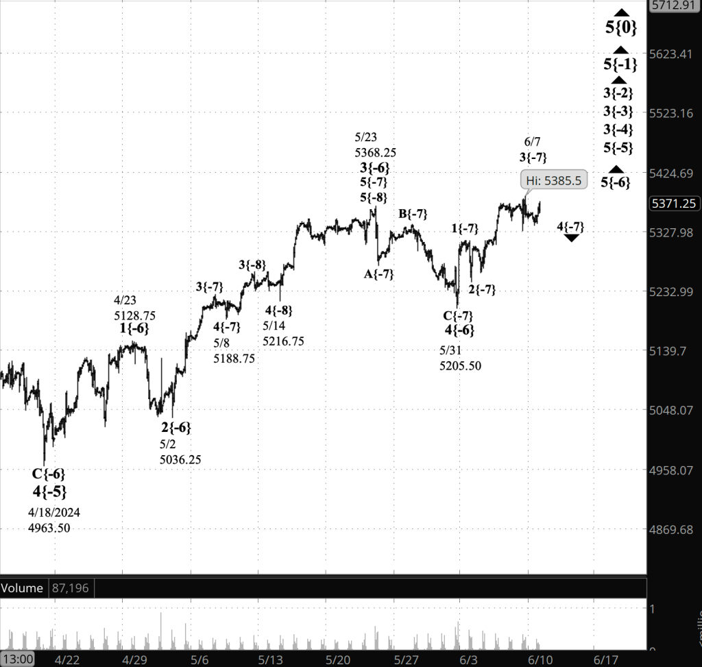 Half an hour before the closing bell. The S&P 500 futures rose into the 5370s during the session, remaining slightly below the overnight high — 5385.50 — as the closing bell approached. The small 4th-wave correction within the uptrending 5th wave that began on May 31 continues.