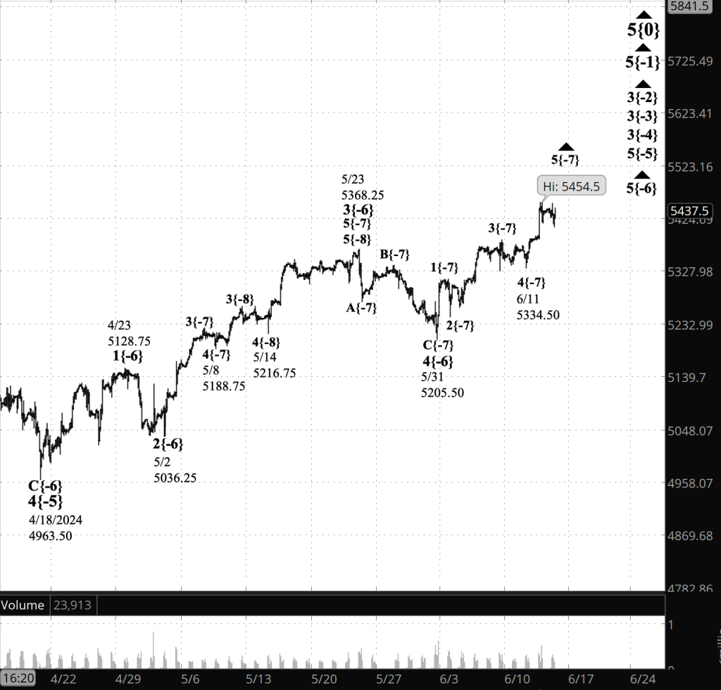 What does it mean? Elliott Wave Theory sees the overnight movement as part of a small uptrending 5th wave that began on June 11. Internally, that 5th wave is working through its middle subwave, wave 3.