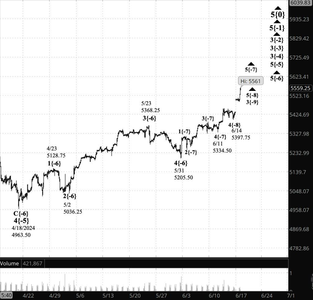 - Wave 5{-6} is underway and is in its final subwave, uptrending wave 5{-7}, which is in wave 5{-8}, also an uptrend.